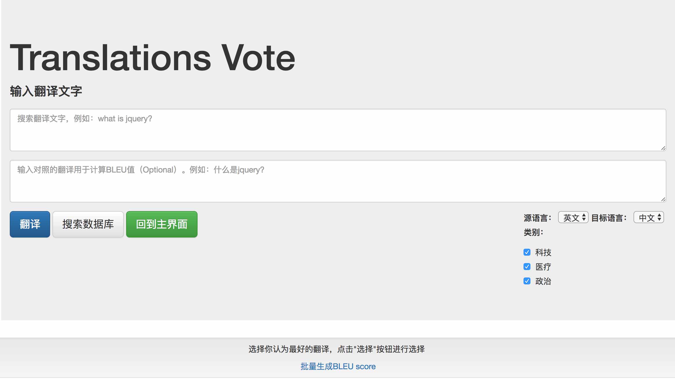 - "Translation Vote" is a web application for collecting user's input for certain translations. It can perform tranlation through different engines and let user to vote for the best one. It also has searching, batch translating functionalities.